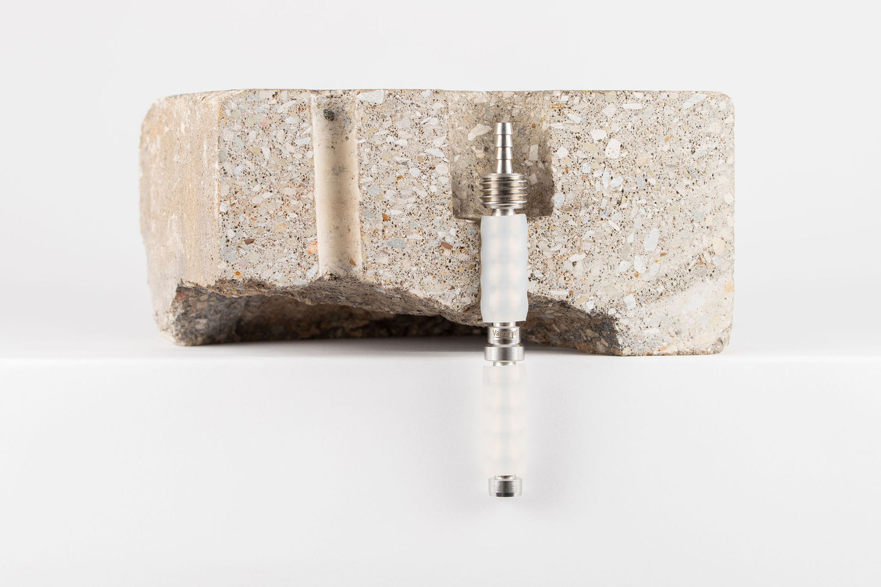 Like the Vapor Pin® barb extension or the Vapor Pin® 1.5-inch extension, the Vapor Pin® sealing extension is placed beneath the Vapor Pin® sampling device to minimize contact between soil gas and the hole in the slab. The sealing extension has the additional advantage of using a second Vapor Pin® sleeve at the base of the slab. Depending on slab thickness, one or more Vapor Pin® 1.5” extensions can be placed between the Vapor Pin® sampling device and the Vapor Pin® sealing extension to extend the assembly to the bottom of the slab. Unlike most stainless steel products from Vapor Pin®, the sealing extension is not designed to be removed or reused.